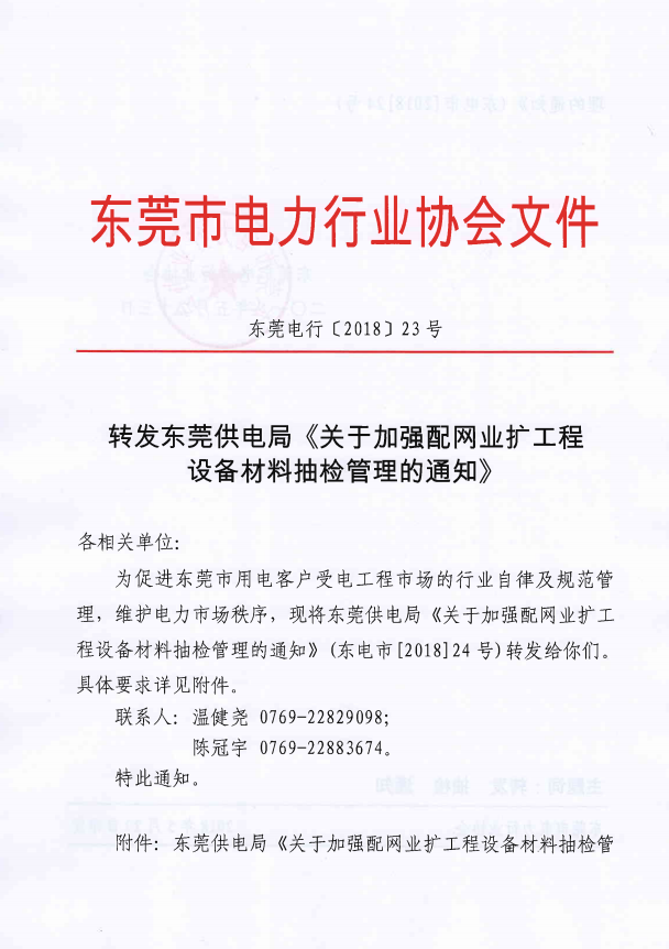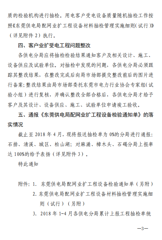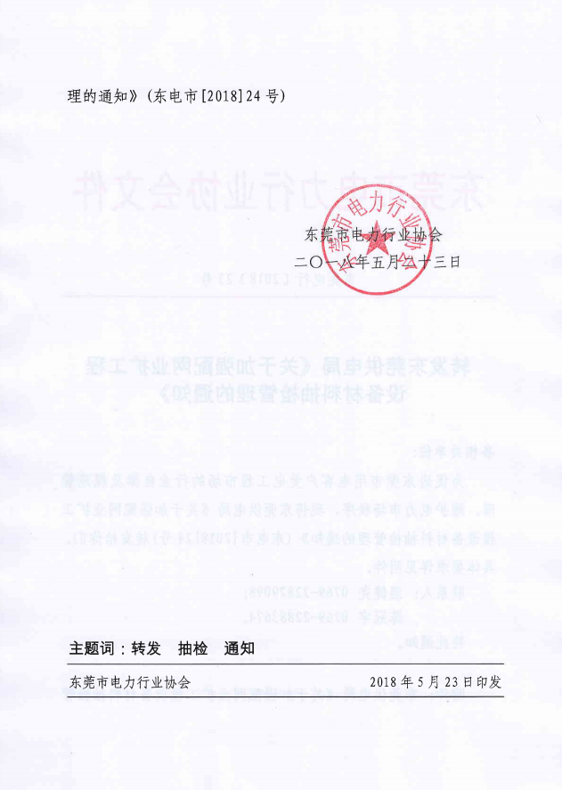 東莞電行〔2018〕23號--轉發東莞供電局《關于加強配網業擴工程設備材料抽檢管理的通知》